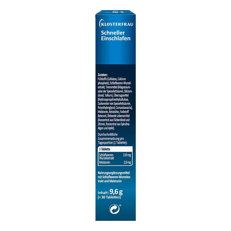 Klosterfrau schneller Einschlafen mit 2,0 mg Melatonin verkürzt die Einschlafzeit.* Melatonin ist ein körpereigener Botenstoff, der den natürlichen Schlaf fördert und den Schlaf-Wach-Rhythmus stabilisiert. Klosterfrau schneller Einschlafen enthält zusätzlich Schlafbeeren-Blätter und -Wurzel Extrakt.