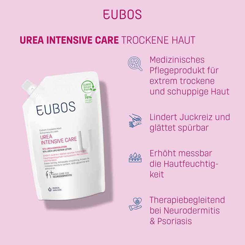 Eubos 10 % Urea Körperlotion versorgt die Haut intensiv mit feuchtigkeitsbindendem Urea und erhöht so deutlich die Hydratationsfähigkeit der Haut. Urea wirkt auch keratolytisch, d. h., oberflächliche Hautschuppen werden gelöst, so dass eine hautglättende Wirkung erzielt wird. Allantoin sowie eine spezielle Lipidkombination mit Süßmandelöl helfen, die natürlichen Schutzfunktion der Haut zu stärken und vor übermäßigem Feuchtigkeitsverlust zu bewahren.