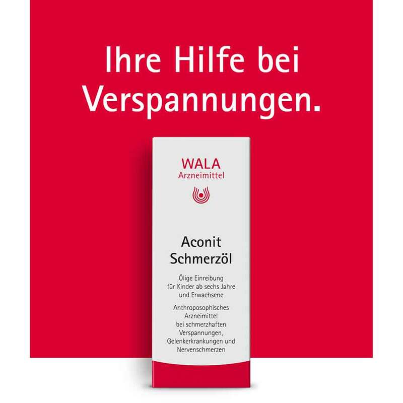 Aconit Schmerzöl. Ölige Einreibung. Anwendungsgebiete gemäß der anthroposophischen Menschen- und Naturerkenntnis. Dazu gehören: Anregung des Wärmeorganismus und Integration von Stoffwechselprozessen bei schmerzhaften entzündlichen Erkrankungen, die vom Nerven-Sinnes-System ausgehen, z.B. Nervenschmerzen (Neuralgien), Nervenentzündungen (Neuritiden), Gürtelrose (Herpes zoster), rheumatische Gelenkerkrankungen. Warnhinweis: Enthält Erdnussöl. WALA Heilmittel GmbH, 73085 Bad Boll/Eckwälden. Zu Risiken und Nebenwirkungen lesen Sie die Packungsbeilage und fragen Sie Ihre Ärztin, Ihren Arzt oder in Ihrer Apotheke.