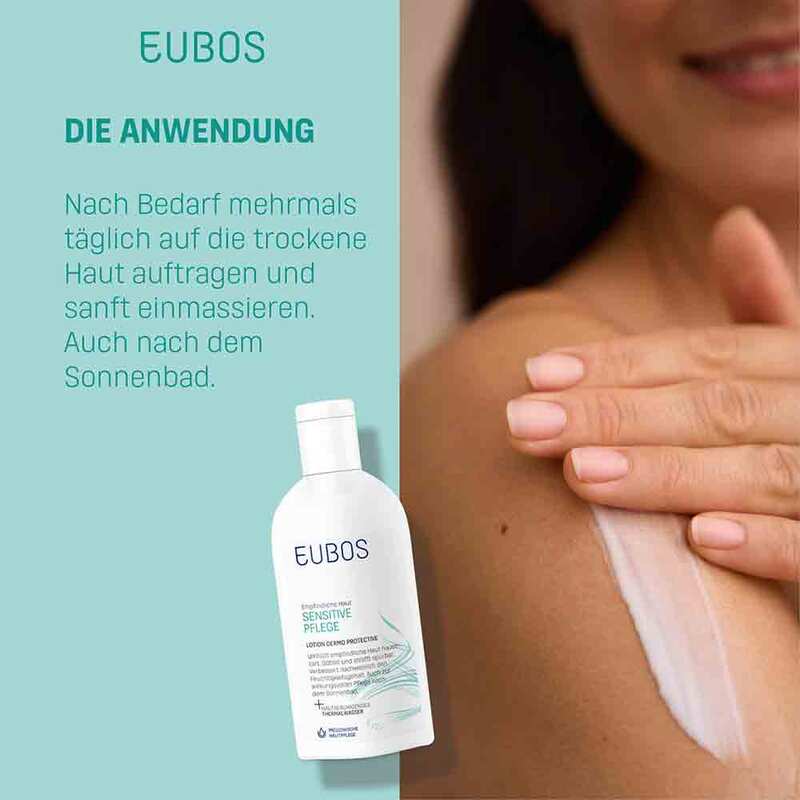 Die Eubos sensitive Pflege Lotion Dermo Protective ist eine schützende Körperpflege für die ganze Familie. Sie beruhigt mit Thermalwasser aus den Pyrenäen. Das enthaltene Macadamia-Nussöl, mit hautähnlicher Palmitoleinsäure, wirkt schützend und pflegend. Die Haut wird spürbar glatter und geschmeidiger. Das Phyto-Wirkstoffsystem mit Avocado- und Shea-Frucht, Allantoin und Vitamin E beruhigt und schützt die Hautbarriere und stärkt die Abwehrfunktion der Haut. Die Hautverträglichkeit wurde dermatologisch bestätigt.