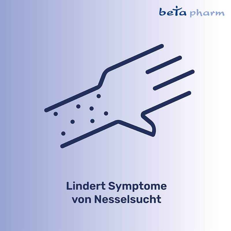 Cetirizin beta® Filmtabletten. Wirkstoff: Cetirizindihydrochlorid. Anw.: Zur Behandlung von Krankheitszeichen bei allerg. Erkrankungen, wie chron. Nesselsucht mit Beschwerden, z. B. Juckreiz, Quaddelbildung, Rötung d. Haut; chron. allerg. Schnupfen; Juckreiz bei chron. Nesselsucht u. bei atopischer Dermatitis (Neurodermitis) mit Beschwerden wie Rötung d. Haut; Heuschnupfen mit Beschwerden, wie z. B. Niesen, Nasenlaufen, Nasenjucken, Nasenverstopfung, Rötung bzw. Jucken d. Augen sowie Tränenfluss; asthmoide Zustände allerg. Herkunft - als unterstützende Maßnahme zur Unterdrückung entspr. Beschwerden. Warnhinw.: Enth. Lactose. Bitte nehmen Sie Cetirizin beta® daher erst nach Rücksprache mit Ihrem Arzt ein, wenn Ihnen bekannt ist, dass Sie unter einer Unverträglichkeit gegenüber bestimmten Zuckern leiden. Zu Risiken und Nebenwirkungen lesen Sie die Packungsbeilage und fragen Sie Ihre Ärztin, Ihren Arzt oder in Ihrer Apotheke.  betapharm Arzneimittel GmbH, 86156 Augsburg.