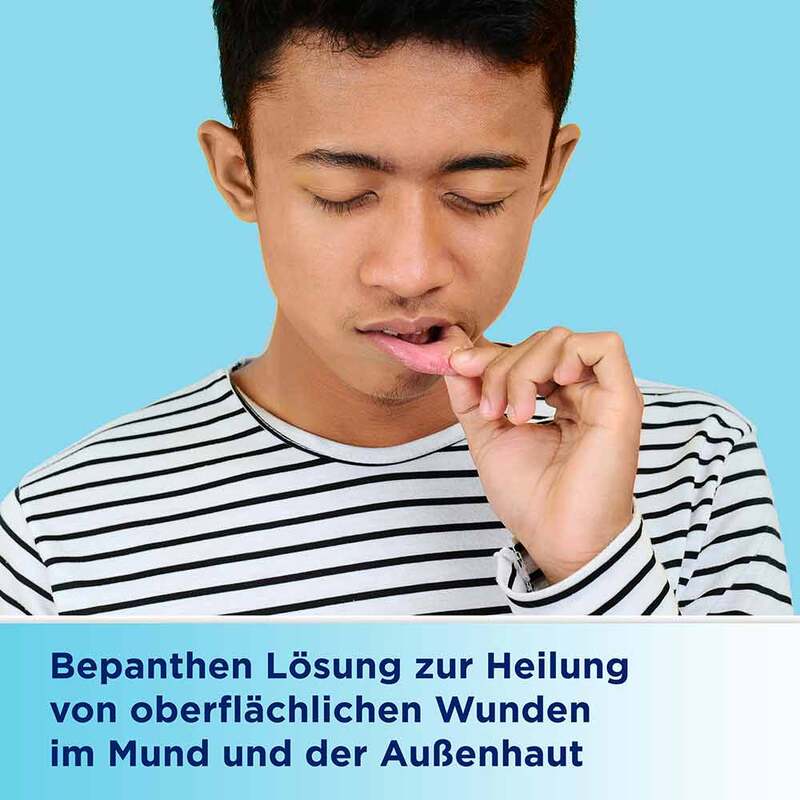 Die Bepanthen® Lösung enthält den Wirkstoff Dexpanthenol in einer wässrigen Lösung. Mit seiner Hilfe ist es möglich, die Produktion neuer, gesunder Hautzellen anzuregen und so die Wundheilung der Mundschleimhaut beziehungsweise Haut zu unterstützen.