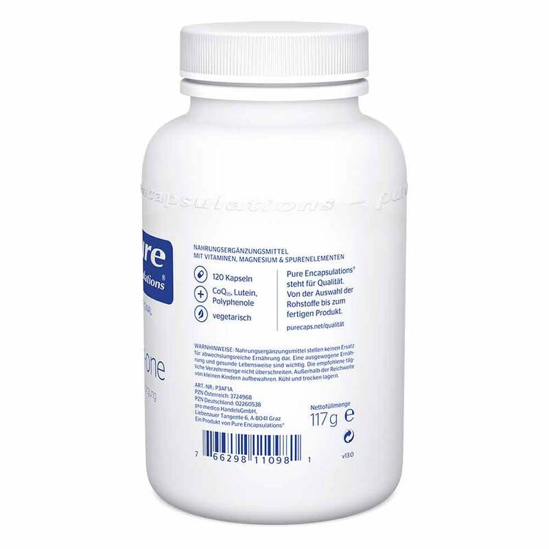 Magnesiumcitrat, Kapsel: Hydroxypropylmethylcellulose, Calciumcitrat, Acerolakirschen-Extrakt, Kaliumcitrat, Ascorbylpalmitat, Niacinamid, Ascorbinsäure, Weintraubenkern-Extrakt, D-alpha-Tocopherolsuccinat, FloraGLO-Lutein, Zinkpicolinat, Calciumpantothenat, Selenmethionin, Coenzym Q10, Hydroxycobalamin (0,1 %), Mangancitrat, natürliches Beta-Carotin (Betanat), Vitamin D3, Pyridoxal-5-Phosphat, Thiamin HCl, Riboflavin-5-Phosphat, Kaliumjodid, Pyridoxin HCl, Riboflavin, Chrompicolinat, Biotin, Folsäure.