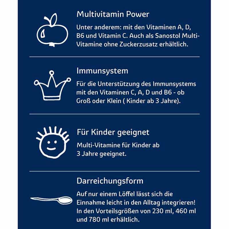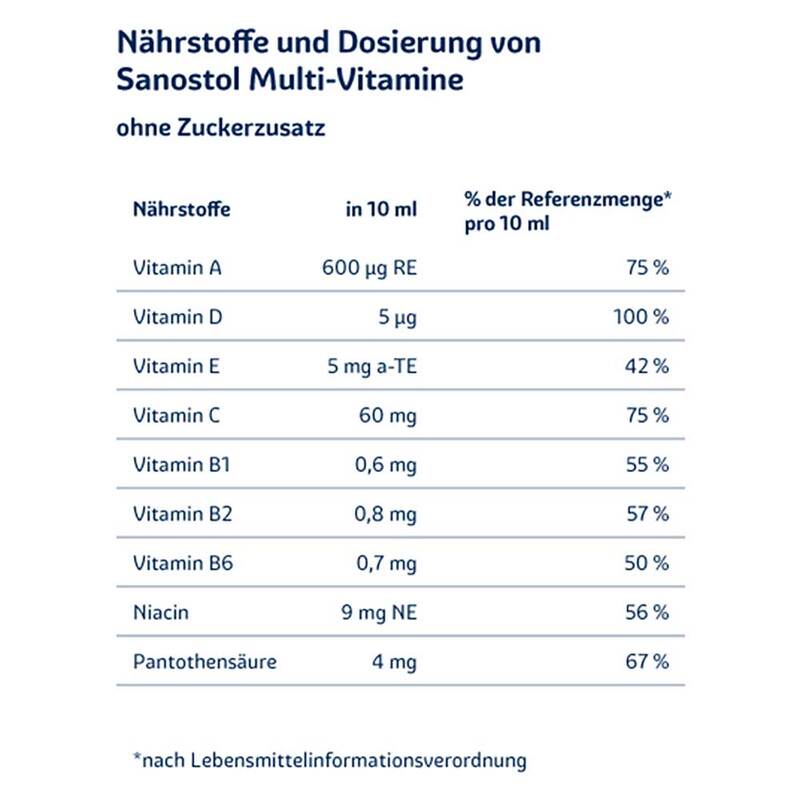 Sanostol ohne Zuckerzusatz schmeckt besonders lecker und trägt z. B. mit den Vitaminen A, D, B6 und Vitamin C zu einer normalen Funktion des Immunsystems bei.* So können Sie – in Phasen besonderer Belastung oder wenn eine gesunde, ausgewogene Ernährung nicht zu bewerkstelligen ist – die Ernährung gezielt und auf leckere Art ergänzen!
