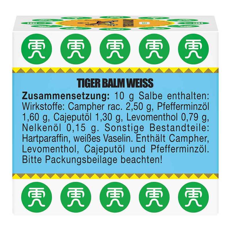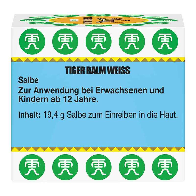 Tiger Balm® Weiss Salbe. Für Erwachsene und Jugendliche ab 12 Jahren. Wirkstoffe: Campher racemisch, Levomenthol, Nelkenöl, Cajeputöl, Pfefferminzöl. Anwendungsgebiete: Zur äußeren Anwendung zur Verbesserung des Befindens bei Erkältungsbeschwerden wie unkomplizierter Schnupfen und Bronchialbeschwerden. Zur Förderung der Hautdurchblutung bei Muskel- und Gelenkbeschwerden wie Verstauchungen, Prellungen, Zerrungen. Warnhinweise: Enthält Campher racemisch, Levomenthol, Cajeput- und Pfefferminzöl. Zu Risiken und Nebenwirkungen lesen Sie die Packungsbeilage und fragen Sie Ihre Ärztin, Ihren Arzt oder in Ihrer Apotheke. Stand 12/2015