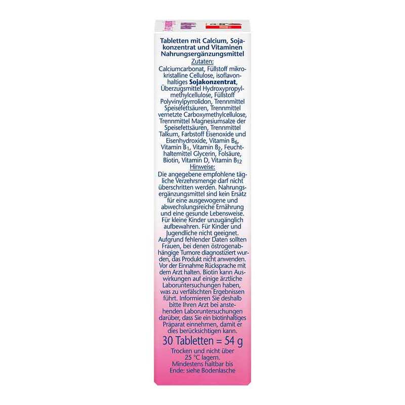 Calciumcarbonat, Füllstoff mikrokristalline Cellulose, isoflavonhaltiges SOJAKONZENTRAT, Überzugsmittel Hydroxypropylmethylcellulose, Füllstoff Polyvinylpyrrolidon, Trennmittel Speisefettsäuren, Trennmittel vernetzte Carboxymethylcellulose, Trennmittel Magnesiumsalze der Speisefettsäuren, Trennmittel Talkum, Farbstoff Eisenoxide und Eisenhydroxide, Vitamin B6, Vitamin B1, Vitamin B2, Feuchthaltemittel Glycerin, Folsäure, Biotin, Vitamin D, Vitamin B12.