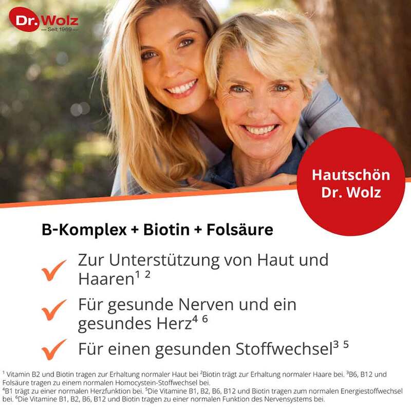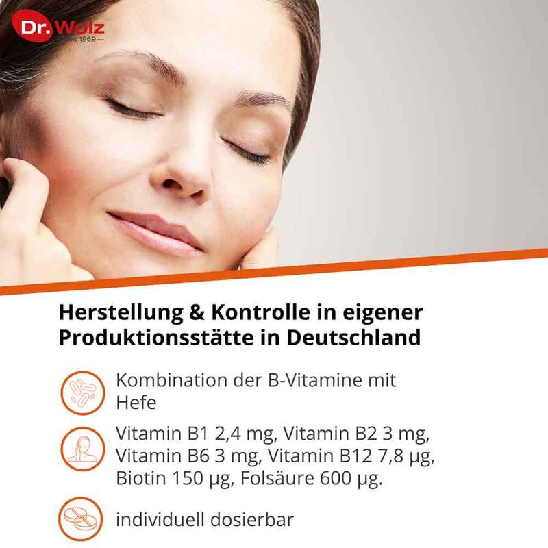 Das Vitamin Biotin regt den Hautstoffwechsel an und ist gut für gesunde Haare. Daher helfen die B-Komplex + Biotin +Folsäure Hefetabletten Dr. Wolz, eine ausreichende Versorgung mit diesen gesunden Vitaminen zu sichern. Die natürliche Hefe ergänzt den Vitaminkomplex ausgezeichnet