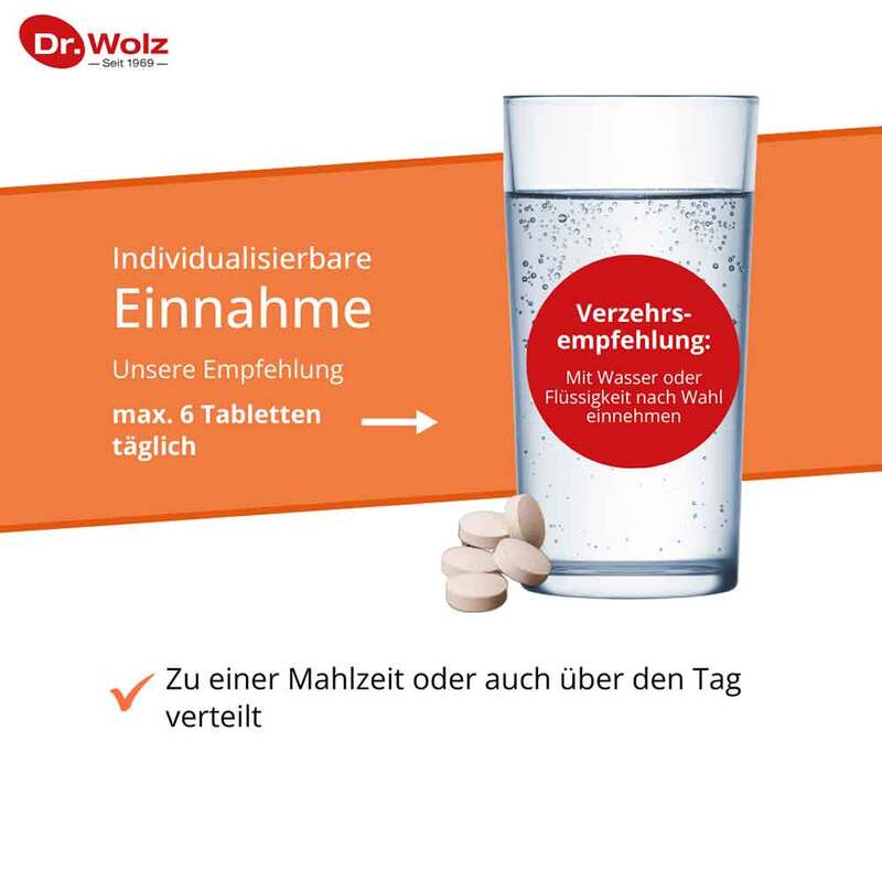 Täglich 6 Tabletten zu den Mahlzeiten mit einer Flüssigkeit Ihrer Wahl verteilt oder auch auf einmal.