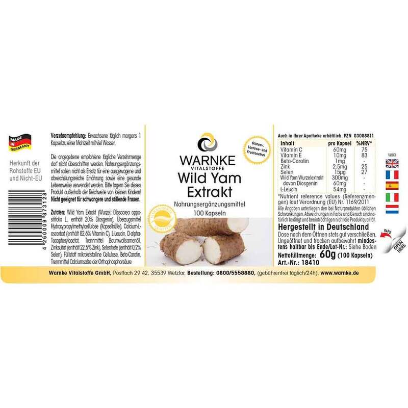 Wild Yam Wurzelextrakt (49,7%; enthält 20% Diosgenin), Überzugsmittel Hydroxypropylmethylcellulose (Kapselhülle) Trennmittel Mikrokristalline Cellulose, Calciumascorbat, D-alpha-Tocopherylacetat, Zinkcitrat, Selenhefe, Trennmittel Magnesiumsalze der Speisefettsäuren, Beta-CarotinVerwendungshinweise