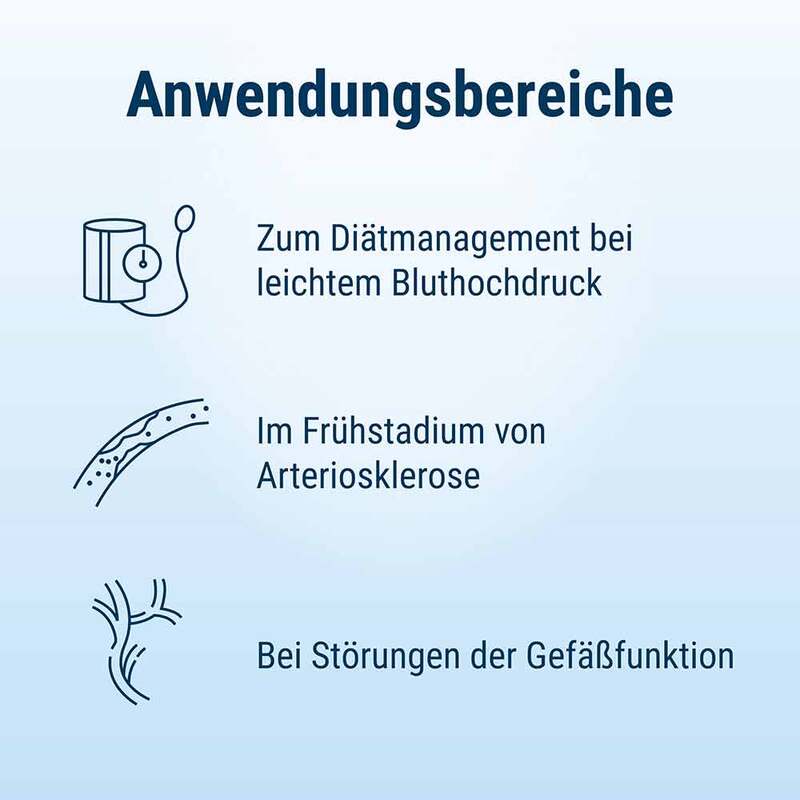 Lebensmittel für besondere medizinische Zwecke (bilanzierte Diät) zum Diätmanagement für Patienten mit leichtem Bluthochdruck, Störungen der Gefäßfunktion* (u. a. Durchblutungsstörungen), im Frühstadium von Arteriosklerose, erhöhtem HomocysteinspiegelNährwertangaben