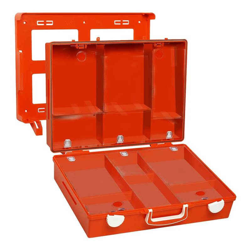 Aus hochschlagfestem ABS-Kunststoff mit umlaufender Gummidichtung. Leichtgängige Drehverschlüsse und verstärkter Tragegriff. Transparente Abdeckplatten zum Schutz der Füllteile. Variable Inneneinteilung durch die Trennstege. Inklusive Wandhalterung mit 90°-Stop-Arretierung, plombierbar. Inklusive Montagematerial und nachleuchtendem Rettungszeichen.