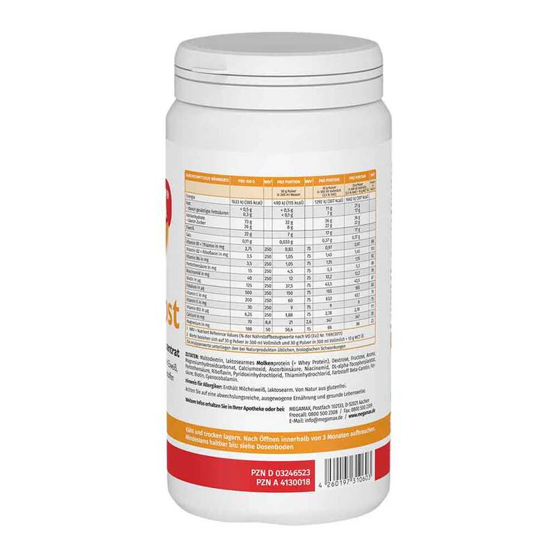 Megamax Aufbaukost ist eine fettarme und leicht verzehrbare Aufbaunahrung mit vielen lebenswichtigen Nährstoffen. Die Aufbaunahrung enthält Eiweiß, Kohlenhydrate, Vitamine und Mineralstoffe. Die im Produkt enthaltenen Proteine tragen zu einer Zunahme und zur Erhaltung von Muskelmasse und zur Erhaltung normaler Knochen bei. Die Mineralstoffe Calcium und Magnesium sorgen zudem in Verbindung mit den Vitaminen B6, B12, Pantothensäure und Niacin für einen normalen Energiestoffwechsel. B-Vitamine unterstützen das Nervensystem und sorgen für normale psychische Funktionen. Biotin, Niacin, Riboflavin leisten einen Beitrag zur Erhaltung gesunder Schleimhäute. Hauptbestandteil der Aufbaunahrung sind Kohlenhydrate.