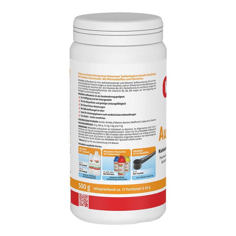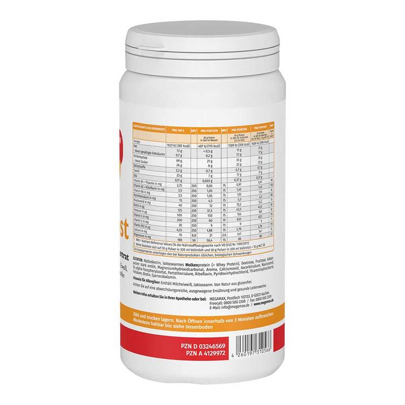 Megamax Aufbaukost ist eine fettarme und leicht verzehrbare Aufbaunahrung mit vielen lebenswichtigen Nährstoffen. Die Aufbaunahrung enthält Eiweiß, Kohlenhydrate, Vitamine und Mineralstoffe. Die im Produkt enthaltenen Proteine tragen zu einer Zunahme und zur Erhaltung von Muskelmasse und zur Erhaltung normaler Knochen bei. Die Mineralstoffe Calcium und Magnesium sorgen zudem in Verbindung mit den Vitaminen B6, B12, Pantothensäure und Niacin für einen normalen Energiestoffwechsel. B-Vitamine unterstützen das Nervensystem und sorgen für normale psychische Funktionen. Biotin, Niacin, Riboflavin leisten einen Beitrag zur Erhaltung gesunder Schleimhäute. Hauptbestandteil der Aufbaunahrung sind Kohlenhydrate.