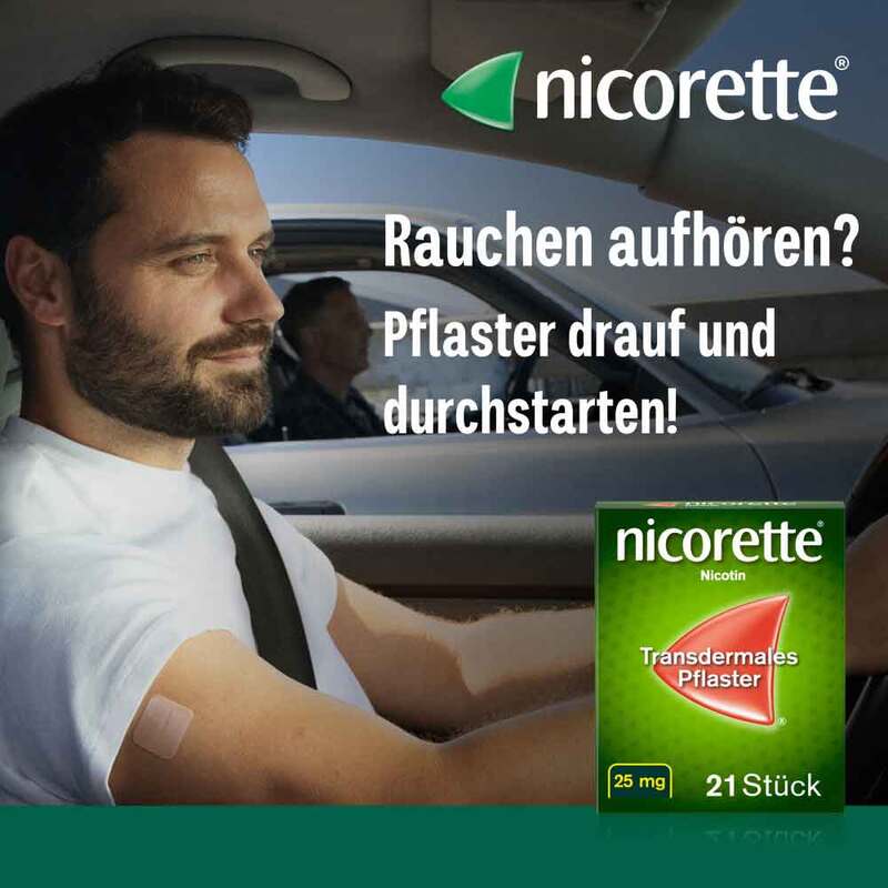 nicorette® TX Pflaster 10 mg, 15 mg, 25 mg Wirkstoff: Nicotin. Anwendungsgebiete: Behandlung der Tabakabhängigkeit durch Linderung der Entzugserscheinungen. Unterstützung der Raucherentwöhnung. Zu Risiken und Nebenwirkungen lesen Sie die Packungsbeilage und fragen Sie Ihre Ärztin, Ihren Arzt oder in Ihrer Apotheke. Kenvue Germany GmbH, 41470 Neuss. Stand: 05/2025