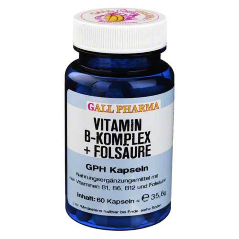 Vitamin B-Komplex + Folsäure GPH Kapseln enthalten 1,4 mg Vitamin B1 (Thiaminhydrochlorid), 2 mg Vitamin B6 (Pyridoxinhydrochlorid), 3 µg Vitamin B12 (Cyancobalamin) und 300 µg Folsäure in drei Hartgelatinekapseln. Die Gruppe der B-Vitamine wird auf Grund ihrer Wasserlöslichkeit im Körper nicht gespeichert und sollte durch die Nahrung oder Ergänzungen ausreichend zugeführt werden.