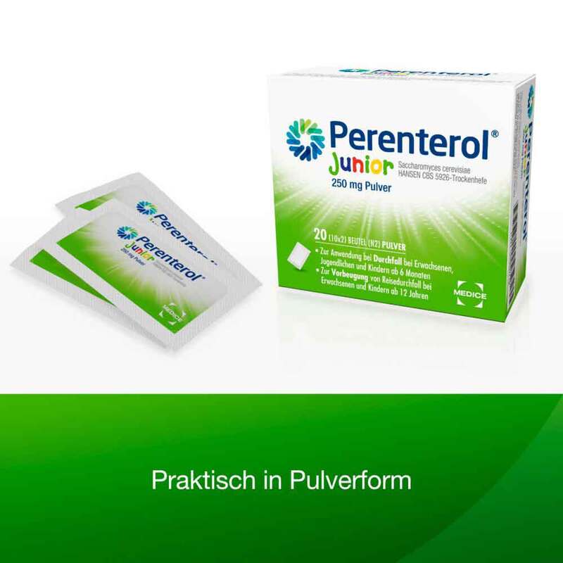 Perenterol® Junior 250 mg Pulver. Wirkstoff: Trockenhefe aus Saccharomyces cerevisiae HANSEN CBS 5926 (Synonym: Saccharomyces boulardii). Anwendungsgebiete: Zur Behandlung der Beschwerden bei akuten Durchfallerkrankungen, auch bei Reisedurchfall und Durchfall unter Sondenernährung. Zur Vorbeugung von Reisedurchfall. Zur Anwendung bei akuten Durchfällen für Kinder und Erwachsene ab 2 Jahren, für Säuglinge ab 6 Monaten nach Rücksprache mit dem Arzt. Zur Vorbeugung von Reisedurchfall für Jugendliche und Erwachsene ab 12 Jahren. Warnhinweis: Enthält Lactose, Fructose und Sorbitol. Zu Risiken und Nebenwirkungen lesen Sie die Packungsbeilage und fragen Sie Ihre Ärztin, Ihren Arzt oder in Ihrer Apotheke.Stand: 08/2024. MEDICE Arzneimittel, 58638 Iserlohn