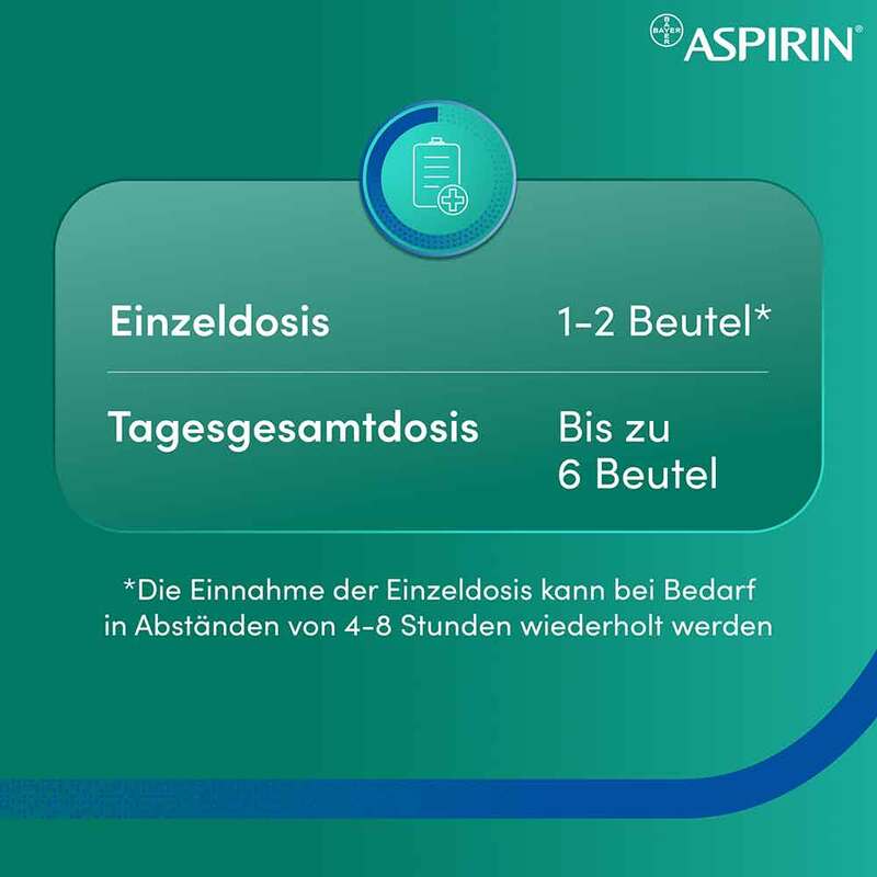Die Aspirin Complex Beutel von Bayer enthalten ein Granulat, das in Wasser eingerührt wird. Falls vom Arzt nicht anders verordnet, nehmen Erwachsene als Einzeldosis 1-2 Beutel, die Tagesgesamtdosis beträgt bis zu 6 Beuteln.