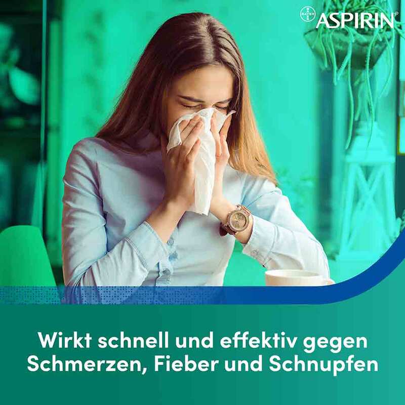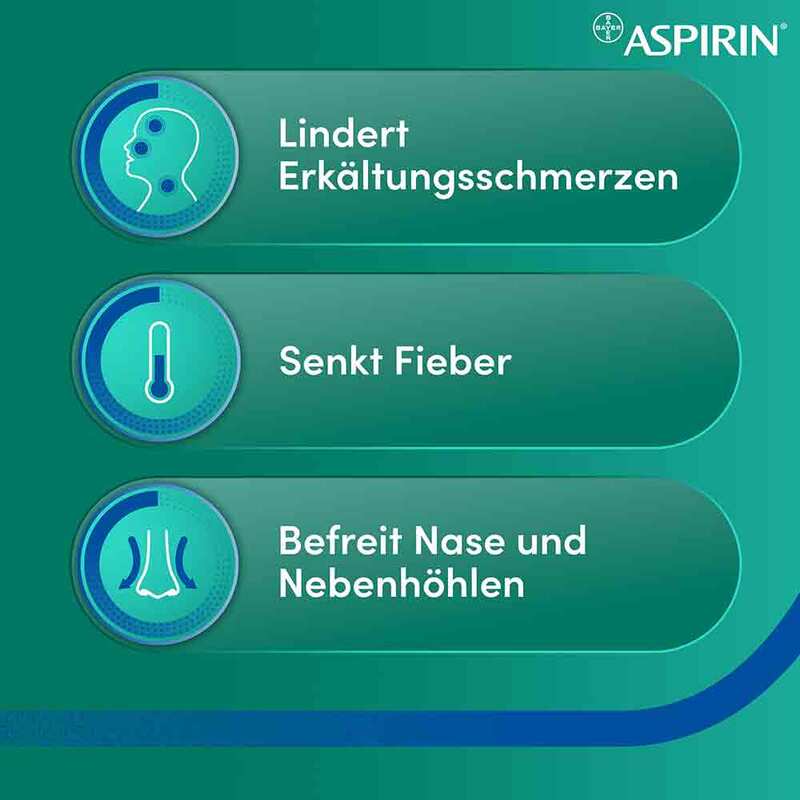 ASPIRIN® COMPLEX Wirkstoffe: Acetylsalicylsäure, Pseudoephedrinhydrochlorid Anwendungsgebiete: Zur symptomatischen Behandlung von Schleimhautschwellung der Nase und Nebenhöhlen bei Schnupfen (Rhinosinusitis) mit Schmerzen und Fieber im Rahmen einer Erkältung bzw. eines grippalen Infektes. Hinweis: Enthält Saccharose und Benzylalkohol. Packungsbeilage beachten. Ohne ärztlichen Rat nicht länger anwenden als in der Packungsbeilage vorgegeben! Zu Risiken und Nebenwirkungen lesen Sie die Packungsbeilage und fragen Sie Ihre Ärztin, Ihren Arzt oder in Ihrer Apotheke. Bayer Vital GmbH, 51368 Leverkusen, Deutschland