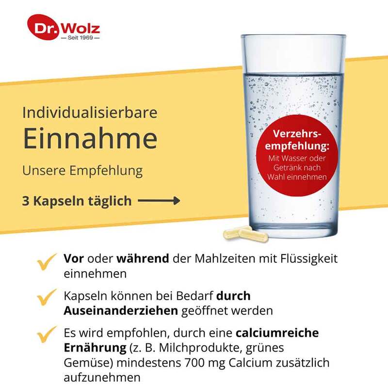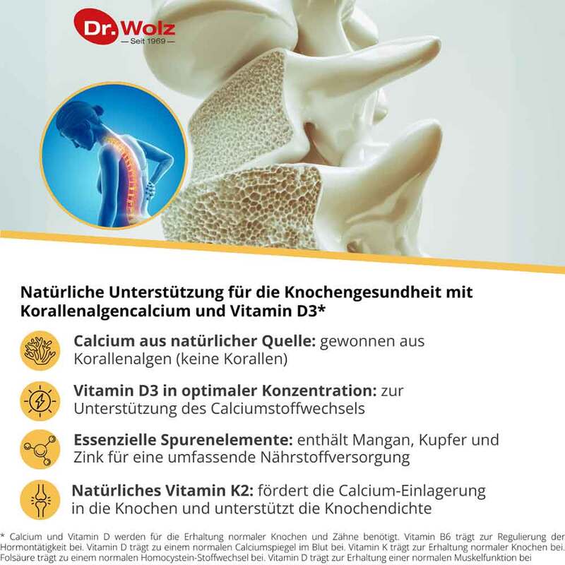 Calcium, Vitamin D3 und Vitamin K2 sind wichtig für Knochen und die Knochenfestigkeit. Während Calcium Baustein der Knochensubstanz ist, trägt Vitamin D zu einem normalen Calciumspiegel im Blut bei und unterstützt die Aufnahme und Verwertung von Calcium. Eine geringe Knochendichte ist ein Risikofaktor für durch Osteoporose bedingte Knochenbrüche. Mit zunehmendem Alter ist der Verlust der Knochenmineralstoffe ein ganz normaler Prozess. Hiervon sind insbesondere Frauen nach der Menopause betroffen. Für den bestmöglichen Erhalt der Knochendichte und zur Verringerung des Risikos für durch Osteoporose bedingte Knochenbrüche ist eine Calcium- und Vitamin D3-reiche Ernährung wichtig.