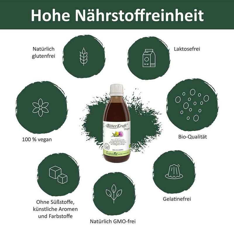 Zu Hildegards Kräuterwissen gehört insbesondere, dass feinbittere Kräuter besondere Eigenschaften haben. Und BitterKraft! Original ist etwas Besonderes. Die erlesenen Pflanzen werden über Wochen lang kalt angesetzt. Sie sind nicht klar filtriert, d.h. BitterKraft! Original schmeckt wie reine Natur. Daher sollte der Kräuterbitter vor Gebrauch gut geschüttelt werden, damit sich die Inhaltstoffe wieder gut verteilen.