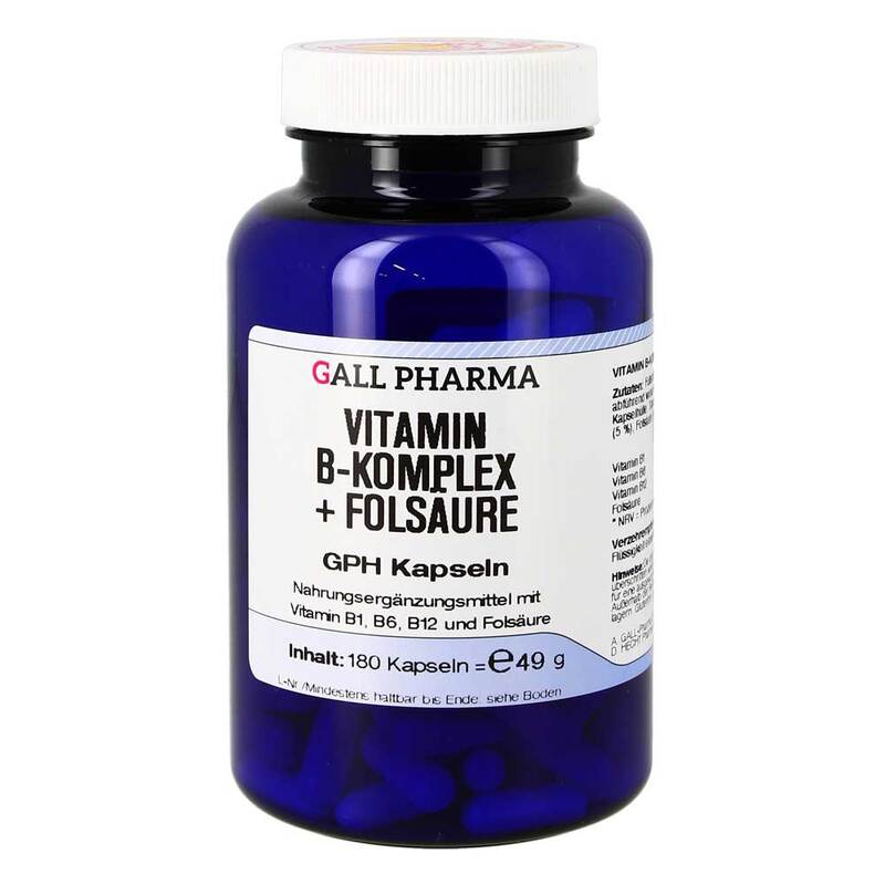 Vitamin B-Komplex + Folsäure GPH Kapseln enthalten 1,4 mg Vitamin B1 (Thiaminhydrochlorid), 2 mg Vitamin B6 (Pyridoxinhydrochlorid), 3 µg Vitamin B12 (Cyancobalamin) und 300 µg Folsäure in drei Hartgelatinekapseln. Die Gruppe der B-Vitamine wird auf Grund ihrer Wasserlöslichkeit im Körper nicht gespeichert und sollte durch die Nahrung oder Ergänzungen ausreichend zugeführt werden.