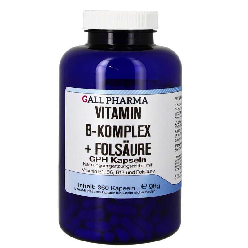 Vitamin B-Komplex + Folsäure GPH Kapseln enthalten 1,4 mg Vitamin B1 (Thiaminhydrochlorid), 2 mg Vitamin B6 (Pyridoxinhydrochlorid), 3 µg Vitamin B12 (Cyancobalamin) und 300 µg Folsäure in drei Hartgelatinekapseln. Die Gruppe der B-Vitamine wird auf Grund ihrer Wasserlöslichkeit im Körper nicht gespeichert und sollte durch die Nahrung oder Ergänzungen ausreichend zugeführt werden.