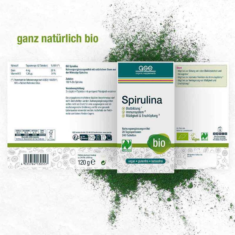100 % Spirulina, ökologisch zertifiziert nach den privaten Richtlinien von Naturland, Deutschland