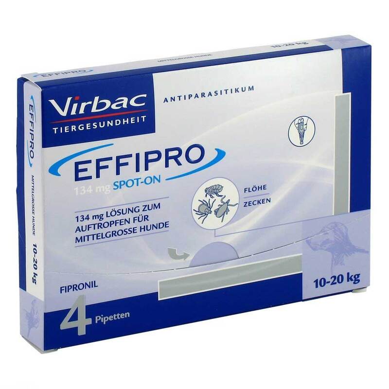 EFFIPRO® 134 mg Lösung zum Auftropfen für mittelgroße Hunde (M) Wirkstoff: Fipronil. Anwendungsgebiet(e): Behandlung eines Floh- (Ctenocephalides spp.) und Zeckenbefalls (Dermacentor reticulatus). Die insektizide Wirksamkeit gegen einen erneuten Befall mit Flöhen besteht für bis zu 8 Wochen. Das Tierarzneimittel hat eine persistierende akarizide Wirkung von bis zu 4 Wochen gegen Zecken (Rhipicephalus sanguineus, Ixodes ricinus, Dermacentor reticulatus). Bei bestimmten Zeckenarten (Rhipicephalus sanguineus und Ixodes ricinus) werden möglicherweise nicht alle Zecken innerhalb der ersten 48 Stunden abgetötet, sondern erst innerhalb einer Woche. Das Tierarzneimittel kann als Teil eines Behandlungsplans zur Kontrolle von Flohallergiedermatitis (FAD) verwendet werden. Pharmazeutischer Unternehmer: Virbac S.A., 1ère avenue – 2065 m – L.I.D., 06516 Carros, Frankreich. Mitvertrieb: Virbac Tierarzneimittel GmbH. Rögen 20, D-23843 Bad Oldesloe. Vertrieb für Österreich: Virbac Österreich GmbH, Hildebrandgasse 27, A-1180 Wien. Apothekenpflichtig.