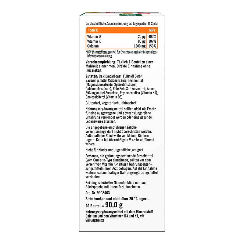 Calciumcarbonat, Füllstoff Sorbit, Säuerungsmittel Citronensäure, Trennmittel (Magnesiumsalze der Speisefettsäuren, Calciumphosphate), Rote Bete Saftkonzentrat, Aroma, Süßungsmittel Sucralose, Phytomenadion (Vitamin K1), Cholecalciferol (Vitamin D3).