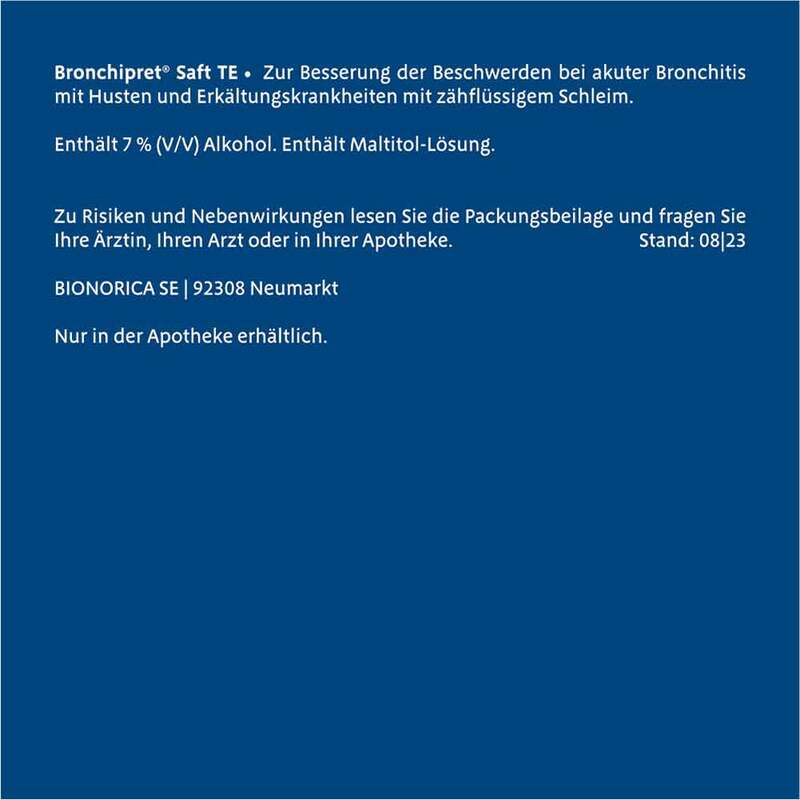 Bronchipret® Saft TE Zur Besserung der Beschwerden bei akuter Bronchitis mit Husten und Erkältungskrankheiten mit zähflüssigem Schleim. Bronchipret® Saft TE enthält 7 % (V/V) Alkohol. Zu Risiken und Nebenwirkungen lesen Sie die Packungsbeilage und fragen Sie Ihre Ärztin, Ihren Arzt oder in Ihrer Apotheke. Stand: 01|23 BIONORICA SE | 92308 Neumarkt
