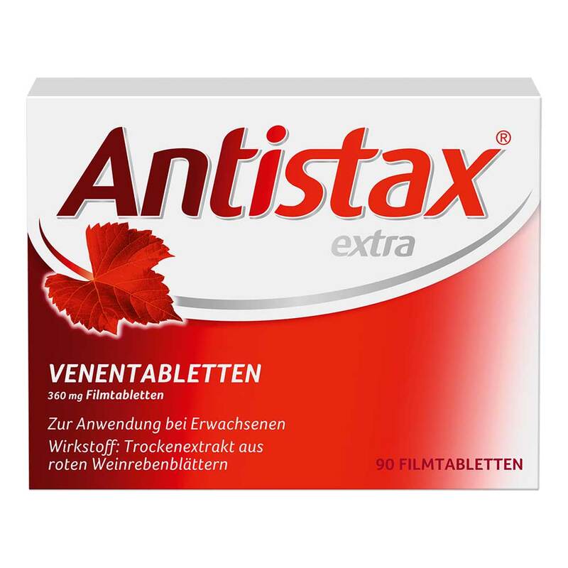 Antistax® extra Venentabletten. 360 mg Filmtabletten Zur Anwendung bei Erwachsenen Wirkstoff: Trockenextrakt aus roten Weinrebenblättern. Zur Behandlung von Beschwerden bei Erkrankungen der Beinvenen (chronische Veneninsuffizienz), die sich zum Beispiel durch Schmerzen und Schweregefühl in den Beinen, Krampfadern, nächtliche Wadenkrämpfe, Juckreiz und geschwollene Beine (Beinödeme) äußern. Zu Risiken und Nebenwirkungen lesen Sie die Packungsbeilage und fragen Sie Ihre Ärztin, Ihren Arzt oder in Ihrer Apotheke. STADA Consumer Health Deutschland GmbH, Stadastraße 2–18, 61118 Bad Vilbel Stand: Oktober 2023