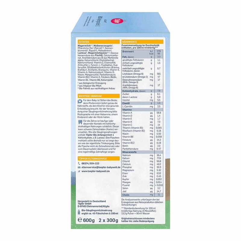 Für die Zähne ist häufiger oder dauernder Kontakt mit kohlenhydrathaltigen Nahrungen schädlich. Dieser kann schwere Zahnschäden (Karies) verursachen. Wie alle Säuglingsnahrungen enthält Töpfer Bio Anfangsmilch 1 Kohlenhydrate, z.B. Lactose. Eine Flaschenmahlzeit sollte deshalb nur so lange dauern wie der eigentliche Trinkvorgang. Bitte die Flasche nicht als Schnullerersatz oder zum Dauernuckeln überlassen und für eine regelmäßige Zahnpflege sorgen.
