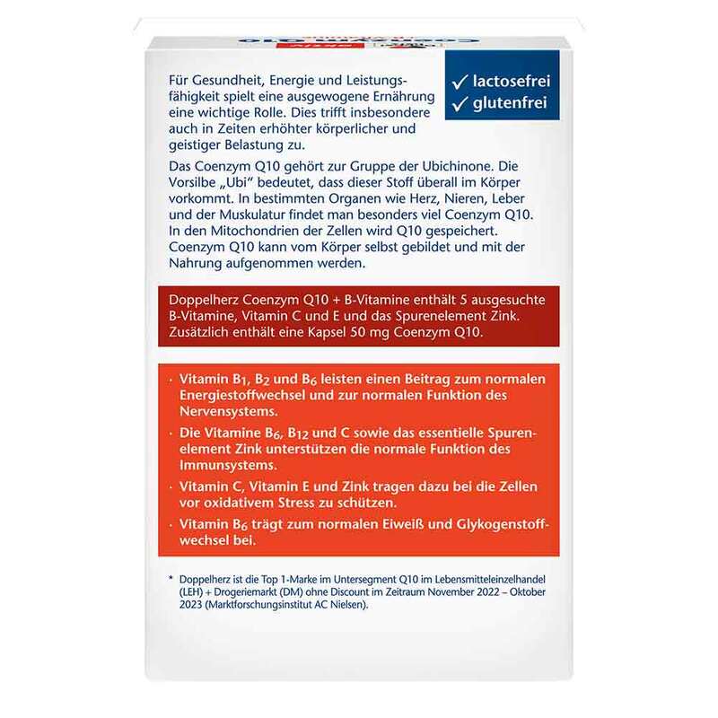 Nahrungsergänzung mit 50 mg Coenzym Q10, B-Vitaminen sowie Vitamin C, Vitamin E und dem Spurenelement Zink