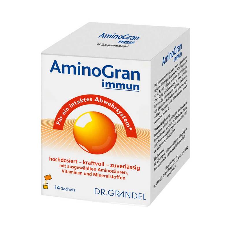 - Eine Kombination von spezifischen Aminosäuren mit weiteren ausgewählten Vitaminen und Mineralstoffen rundet DR. GRANDEL AminoGran immun ab.