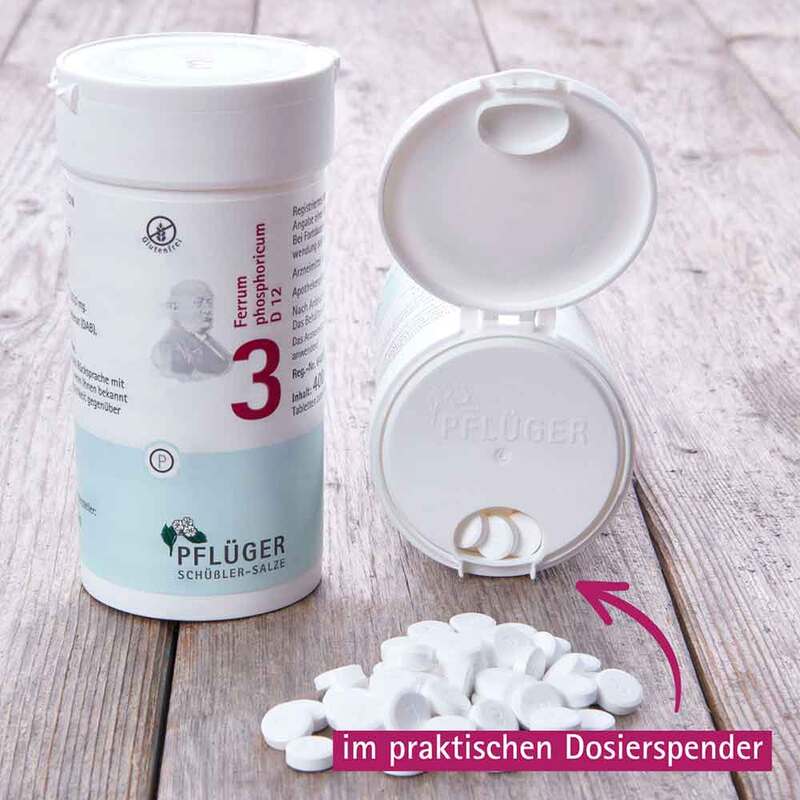 Biochemie Pflüger® Nr. 3 Ferrum phosphoricum D12, Zusammensetzung: 1 Tablette enthält: Wirkstoff: Ferrum phosphoricum Trit. D12 250 mg. Sonstige Bestandteile: Calciumbehenat (DAB), Kartoffelstärke. Registriertes homöopathisches Arzneimittel, daher ohne Angabe einer therapeutischen Indikation. Gegenanzeigen/Nebenwirkungen: keine bekannt. Enthält Lactose. Packungsbeilage beachten. Zu Risiken und Nebenwirkungen lesen Sie die Packungsbeilage und fragen Sie Ihre Ärztin, Ihren Arzt oder in Ihrer Apotheke. Homöopathisches Laboratorium Alexander Pflüger GmbH & Co. KG | 33378 Rheda-Wiedenbrück | info@pflueger.de | www.pflueger.de