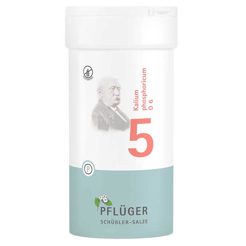 Biochemie Pflüger® Nr. 5 Kalium phosphoricum D 6 , Zusammensetzung: 1 Tablette enthält: Wirkstoff: Kalium phosphoricum D 6 250 mg. Sonstige Bestandteile: Calciumbehenat (DAB), Kartoffelstärke. Registriertes homöopathisches Arzneimittel, daher ohne Angabe einer therapeutischen Indikation. Gegenanzeigen/Nebenwirkungen: keine bekannt. Enthält Lactose. Packungsbeilage beachten. Zu Risiken und Nebenwirkungen lesen Sie die Packungsbeilage und fragen Sie Ihre Ärztin, Ihren Arzt oder in Ihrer Apotheke. Homöopathisches Laboratorium Alexander Pflüger GmbH & Co. KG, 33378 Rheda-Wiedenbrück | info@pflueger.de | www.pflueger.de