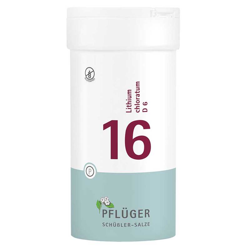 Biochemie Pflüger® Nr.15 Lithium chloratum D 6, Zusammensetzung: 1 Tablette enthält: Wirkstoff: Lithium chloratum Trit. D 6 250 mg. Sonstige Bestandteile: Calciumbehenat (DAB), Kartoffelstärke. Registriertes homöopathisches Arzneimittel, daher ohne Angabe einer therapeutischen Indikation. Gegenanzeigen/Nebenwirkungen: keine bekannt. Enthält Lactose. Packungsbeilage beachten. Zu Risiken und Nebenwirkungen lesen Sie die Packungsbeilage und fragen Sie Ihre Ärztin, Ihren Arzt oder in Ihrer Apotheke. Homöopathisches Laboratorium Alexander Pflüger GmbH & Co. KG, 33378 Rheda-Wiedenbrück | info@pflueger.de | www.pflueger.de