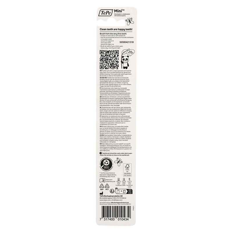Mit einem kleinen, schmal zulaufendem Bürstenkopf und extra weichen Borsten ist TePe Mini für Kinder von 0 bis ca. 3-4 Jahren empfohlen. Der Griff passt in Kinderhände, ist aber noch groß genug, dass Eltern ihren Kindern beim Zähneputzen helfen können. TePe Mini gibt es in fröhlichen Farben und mit lustigen Motiven.