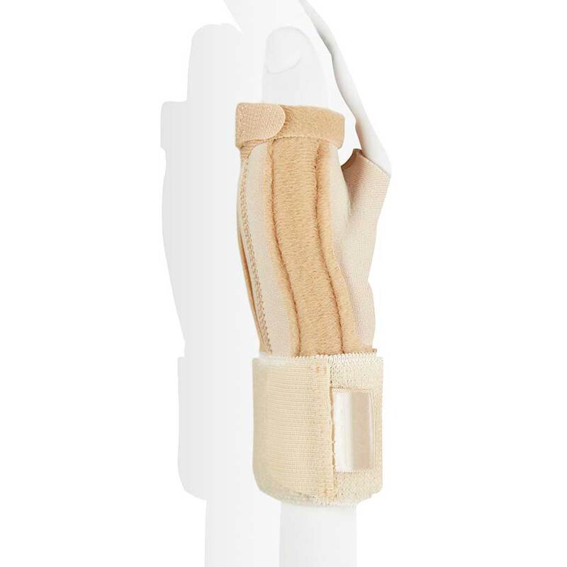 - Öffnen Sie alle Klettverschlüsse und stecken Sie den Daumen in das Daumenloch. Wickeln Sie die Bandage um die Hand und schließen Sie den Verschluss unter dem Handgelenk.