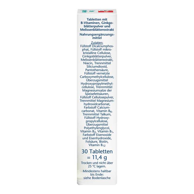 1,1 mg Vitamin B1, 1,4 mg Vitamin B2, 1,4 mg Vitamin B6, 2,5 µg Vitamin B12, 6 mg Pantothensäure, 200 µg Folsäure, 16 mg Niacin, 50 µg Biotin, 50 mg Ginkgoblätterextrakt, 40 mg Melissenblätterextrakt.