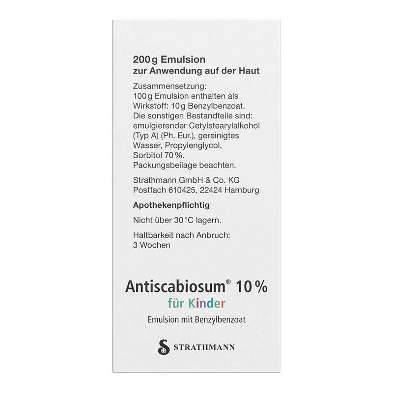 Antiscabiosum® 10 % für Kinder. Emulsion. Wirkstoff: Benzylbenzoat; 10g/100g. Sonstige Bestandteile: emulgierender Cetylstearylalkohol (Typ A), gereinigtes Wasser, Propylenglykol, Sorbitol 70 %. Anwendungsgebiet: Behandlung von Scabies bei Kindern über 6 Jahren, als weniger toxisches Mittel, alternativ zu ausreichend untersuchten Antiscabiosa. Kinder von 1 bis 6 Jahren dürfen nur behandelt werden, wenn keine zusätzlichen Hautschäden bestehen, welche die Aufnahme des Wirkstoffs begünstigen könnten und wenn die Behandlung unter sorgfältiger ärztlicher Kontrolle erfolgt. Gegenanzeigen: Überempfindlichkeit gg. Benzylbenzoat, Benzoesäure, Benzylalkohol o. einen der sonstigen Bestandteile. Stillzeit. Säuglinge. Kinder mit großflächigen Hauterkrankungen wie Psoriasis, Neurodermitis, Ekzeme. Bei Neugeborenen mit Zeichen der Unreife Gasping-Syndrom möglich. Nebenwirkungen: Selten: Reizungen von Haut u. Schleimhäuten, postscabiöses Ekzem. Nicht bekannt: Überempfindlichkeitsreaktionen (Unwohlsein, Urticaria, Angioödem, Kontaktdermatitis), epileptische Anfälle bei Kindern. Vorsichtsmaßnahmen u. Warnhinweise: Nicht an Augen, Schleimhäuten oder auf stark irritierter Haut anwenden. Bei epileptischen Anfällen in der Vorgeschichte Krampfanfälle möglich. Während der Behandlung intensive Sonnenbestrahlung vermeiden. Farbveränderungen bei empfindl. Oberflächen möglich. Vorsicht in der Schwangerschaft. Vorsicht bei Kindern zwischen 1 u. 6 Jahren. Enthält Cetylstearylalkohol und Propylenglykol. Packungsbeilage beachten. Stand: 02.2021. Strathmann GmbH & Co. KG, Postfach 610425, 22424 Hamburg