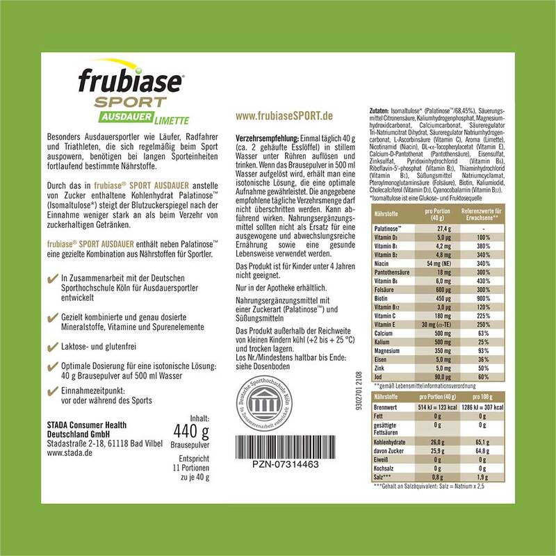 Isomaltulose* ( Palatinose 68,45 %), Säuerungsmittel Citronensäure, Kaliumhydrogenphosphat, Magnesiumhydroxidcarbonat, Calciumcarbonat, Säureregulator Tri-Natriumcitrat Dihydrat, Säureregulator Natriumhydrogencarbonat, L-Ascorbinsäure ( Vitamin C), Aroma ( Limette), Nicotinamid ( Niacin), DL-a-Tocopherylacetat (Vitamin E), Calcium-D-Pantothenat (Pantothensäure), Eisensulfat, Zinksulfat, Pyridoxinhydrochlorid ( Vitamin B6), Riboflavin-5-Phosphat (Vitamin B2), Thiaminhydrochlorid (Vitamin B1), Süßstoff-Natrium-Cyclamat, Pteroyl-monoglutaminsäure (Folsäure), Biotin, Kaliumiodid, Cholecalciferol (Vitamin D3), Cyanocobalamin (Vitamin B12),