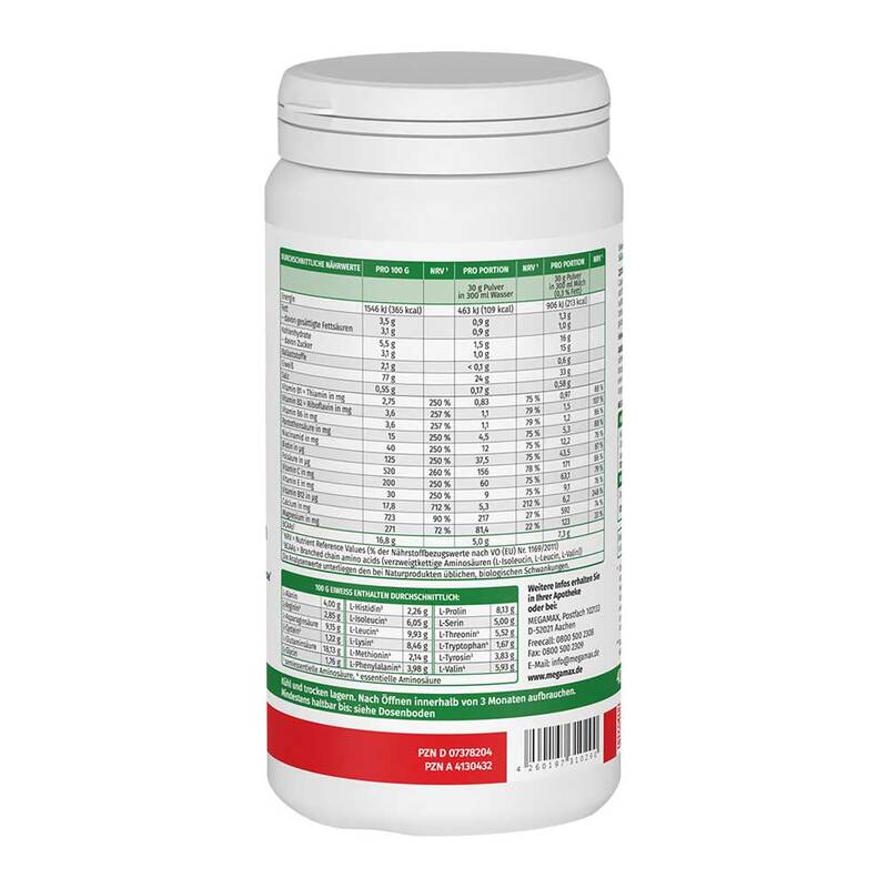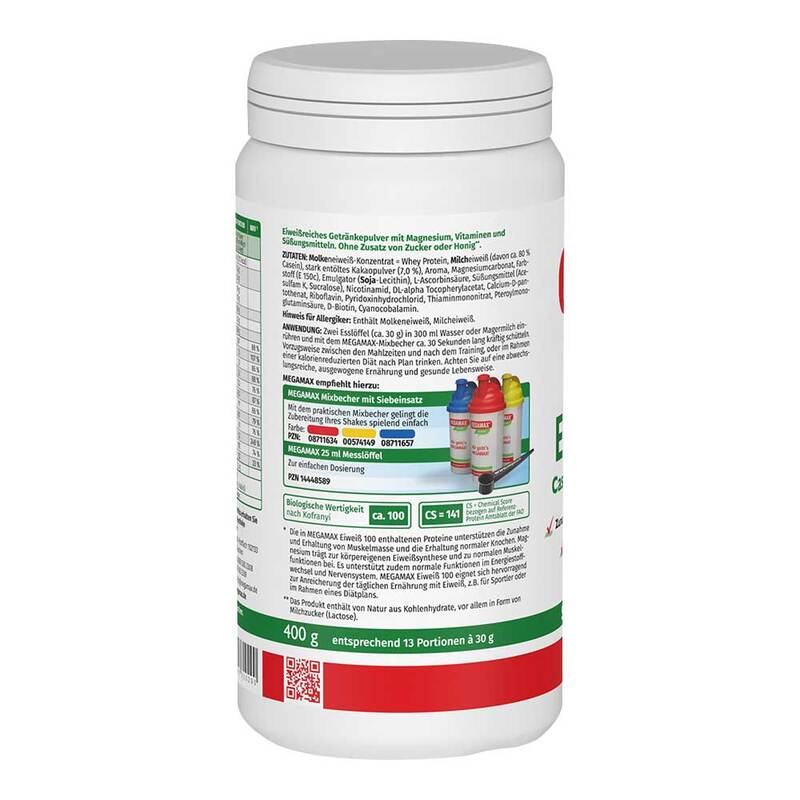 MEGAMAX Eiweiß 100 besteht aus Milcheiweiß und Molkenprotein. Diese Proteine unterstützen Ihren Körper bei der Zunahme und Erhaltung von Muskelmasse und tragen auch zu einer Erhaltung normaler Knochen bei. Daneben enthält MEGAMAX Eiweiß 100 auch eine Auswahl von Vitaminen. Vitamin B12 zum Beispiel trägt zu einem normalen Ablauf Ihres Energiestoffwechsels bei und Vitamin C unterstützt die normale Funktion Ihres Immunsystems während und nach intensiver körperlicher Betätigung.