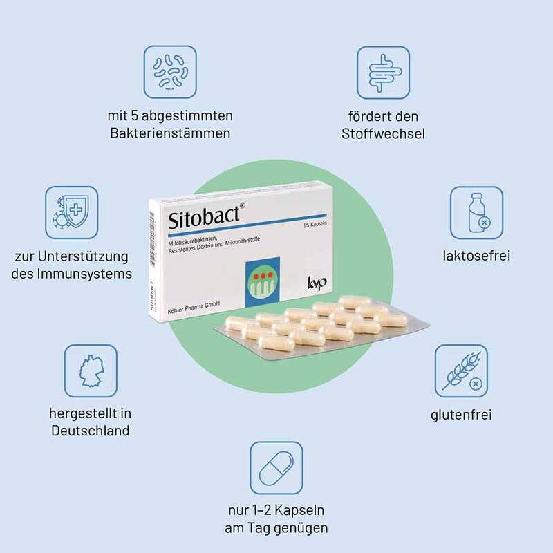 Sitobact enthält einen aufeinander abgestimmten Mix von fünf Stämmen probiotischer Milchsäurebakterien. Die Milchsäurebakterien sind dabei für die Magenpassage besonders „verpackt“, damit sie lebend in den Darm gelangen. Mit dem zugefügten Präbiotikum Inulin wird gleichzeitig die Ernährung der zugeführten Milchsäurebakterien sichergestellt. Darüber hinaus enthält Sitobact die essentiellen Mikronährstoffe Zink, Folsäure, Vitamin D3 und Vitamin B12, um so zusätzlich die Funktion des Immunsystems zu unterstützen.