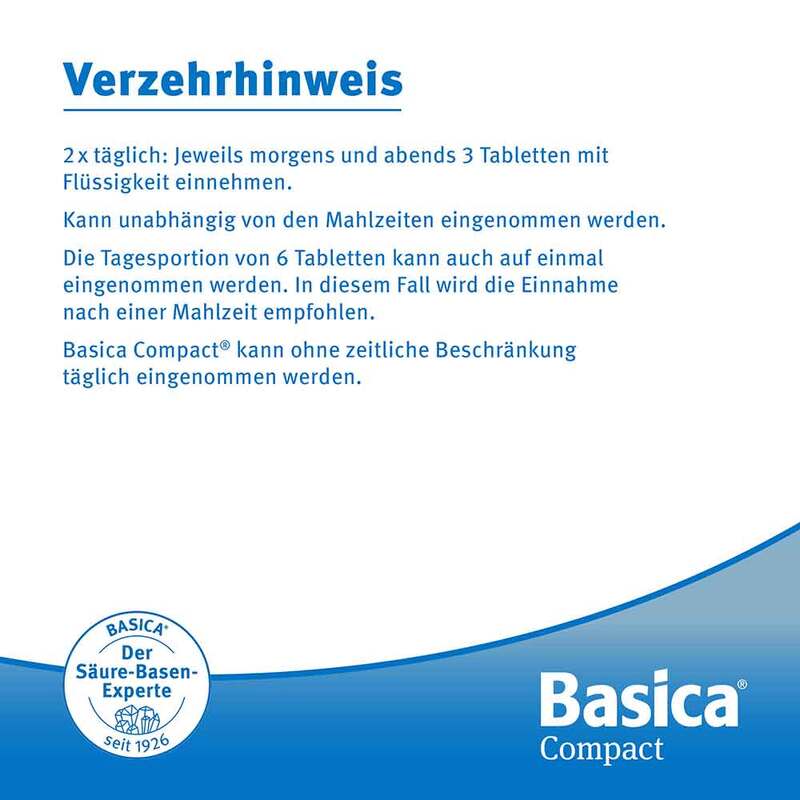 Hinweis für Diabetiker: Eine Tagesportion (6 Tabletten) Basica Compact entspricht weniger als 0,1 BE bzw. 25 kJ (6 kcal)