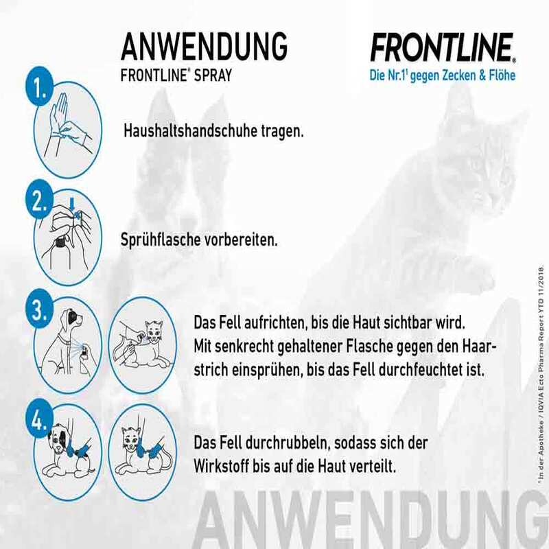 FRONTLINE® SPRAY, 2,5 mg/ml, Spray zur Anwendung auf der Haut, Lösung für Hunde und Katzen. Wirkstoff: Fipronil. Anwendungsgebiete: Zur Behandlung von Hunden und Katzen gegen Floh-, Zecken- und Haarlingsbefall. Abtötung von Flöhen (Ctenocephalides spp.). Die insektizide Wirksamkeit gegen adulte Flöhe bleibt bei Hunden bis zu 3 Monaten, bei Katzen bis zu 6 Wochen erhalten. Abtötung von Zecken (Ixodes ricinus, Rhipicephalus sanguineus). Die akarizide Wirksamkeit gegen Zecken hält bei Hunden und Katzen bis zu 4 Wochen an. Abtötung von Haarlingen (Trichodectes canis, Felicola subrostratus). Die insektizide Wirksamkeit gegen Haarlinge hält bei Hunden und Katzen bis zu 4 Wochen an. Zur Behandlung und Kontrolle der Flohstichallergie (Flohallergiedermatitis = FAD). [Okt 2017] Zu Risiken und Nebenwirkungen lesen Sie die Packungsbeilage und fragen Sie Ihre Ärztin, Ihren Arzt oder in Ihrer Apotheke.