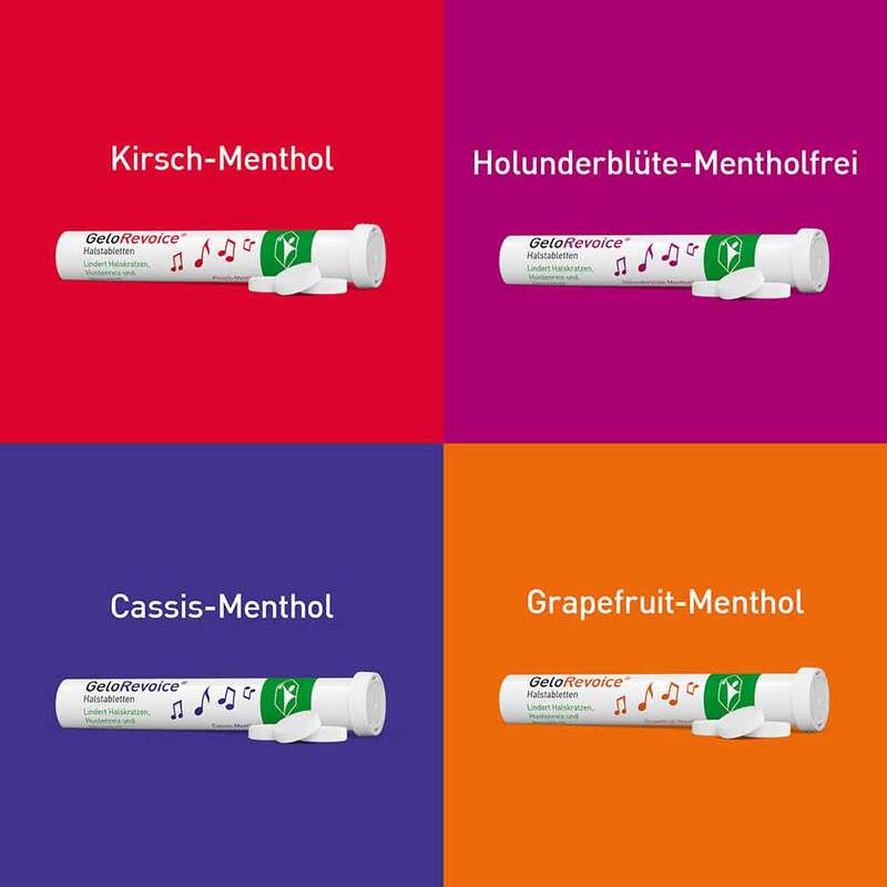 GeloRevoice® gibt es in den vier Geschmacksvarianten: fruchtiges Kirsch-Menthol, aromatisches Cassis-Menthol und frisches Grapefruit-Menthol sowie liebliches Holunderblüte-Mentholfrei.