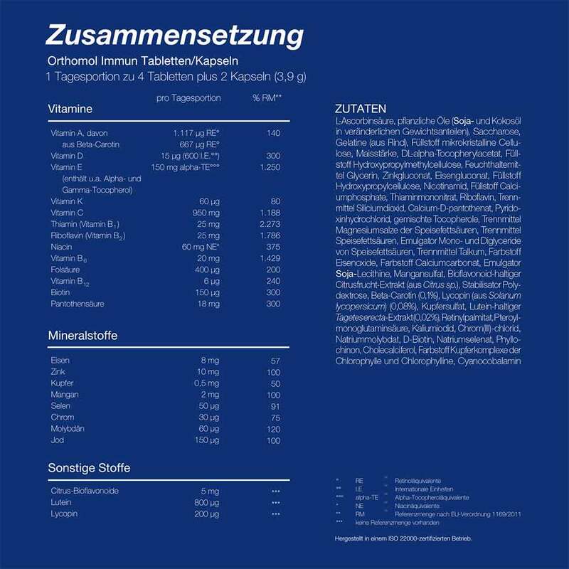 Orthomol Immun ist ein Nahrungsergänzungsmittel mit wichtigen Mikronährstoffen für das Immunsystem.* Es enthält u.a. Vitamin C, D, E, A und die Spurenelemente Selen und Zink.
