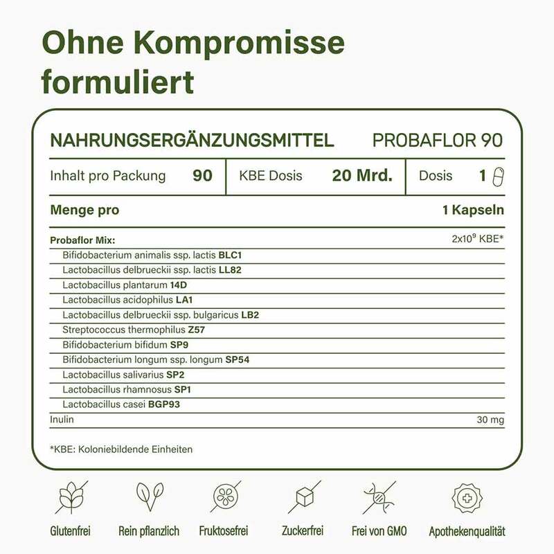 Bifidobacterium lactis, Inulin, Lactococcus lactis, Lactobacillus plantarum, Lactobacillus acidophilus, Streptococcus thermophilus, Bifidobacterium longum, Lactobacillus rhamnosus, Lactobacillus bulgaricus, Bifidobacterium bifidum, Lactobacillus salivarius, Lactobacillus casei. Füllstoff/Bulking agent: Maisstärke/corn starch, Modifizierte Stärke/Corn starch pregelatinized. Kapselhülle/Capsule shell: Hydroxypropylmethylcellulose, Gellan. Trennmittel/Anticaking agent: Magnesium stearate