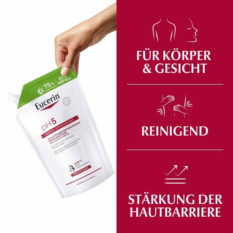 Die Eucerin pH5 Waschlotion ist ein seifenfreies, mildes Reinigungsprodukt für den Körper. Die Waschlotion eignet sich besonders für die sanfte Reinigung von Gesicht und Körper sowie für empfindliche und trockene Haut, denn diese neigt dazu, besonders auf Umweltreize mit Spannungsgefühl, Hautrötungen und Hautirritationen zu reagieren. Daher braucht strapazierte Haut eine besonders milde Reinigung, die ihre physiologische Balance aufrechterhält.